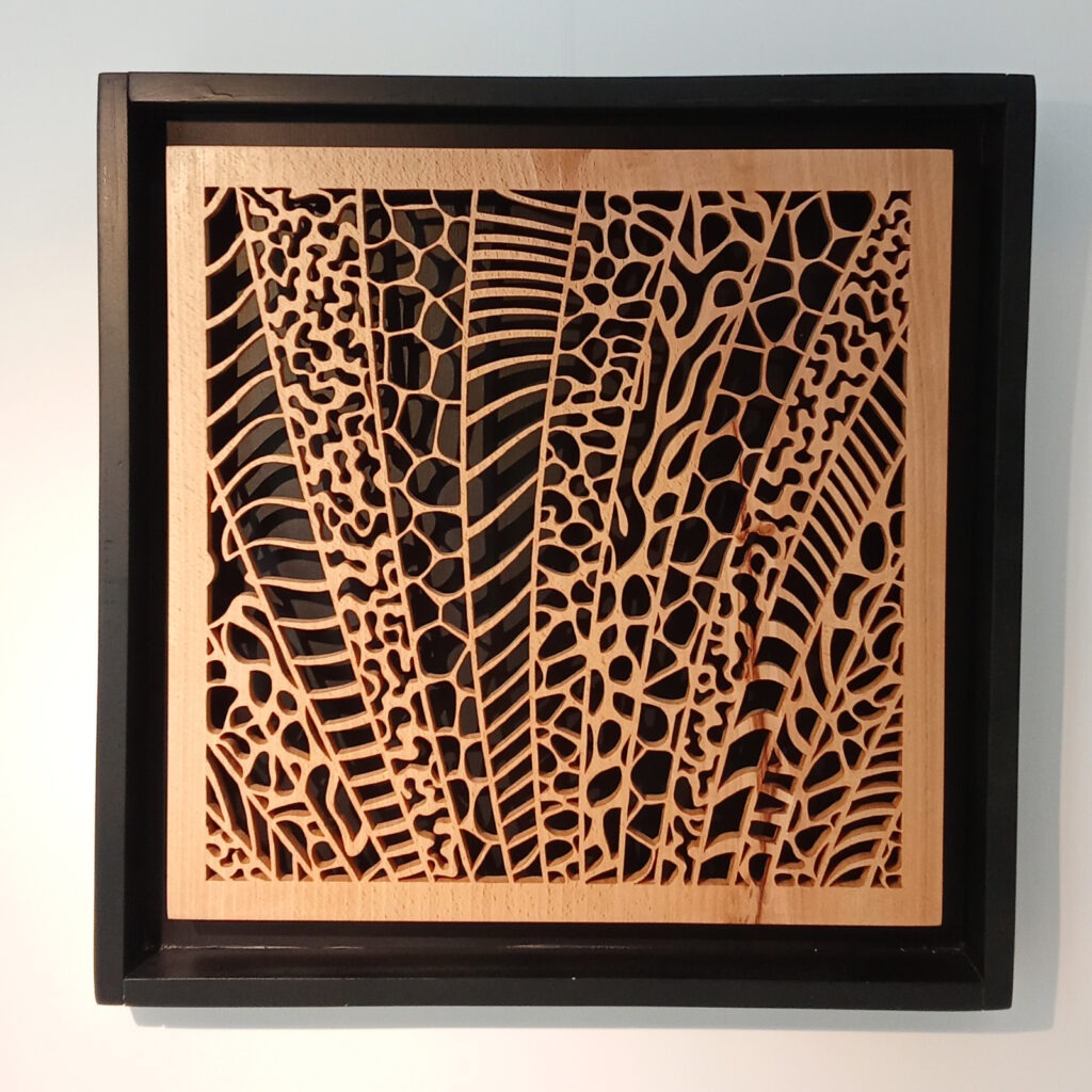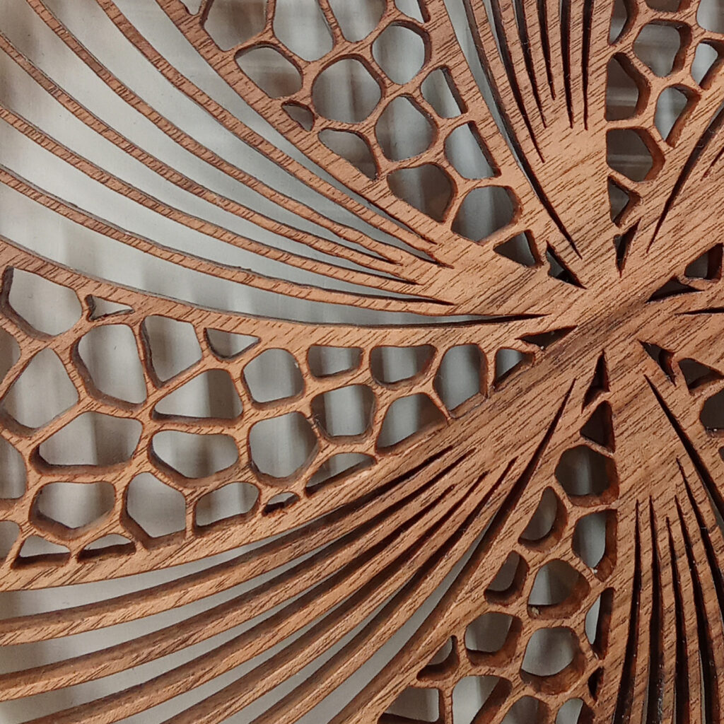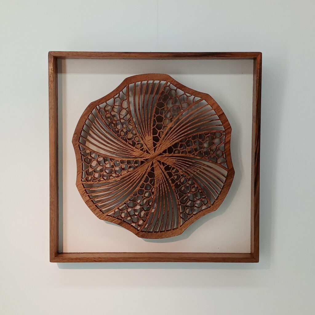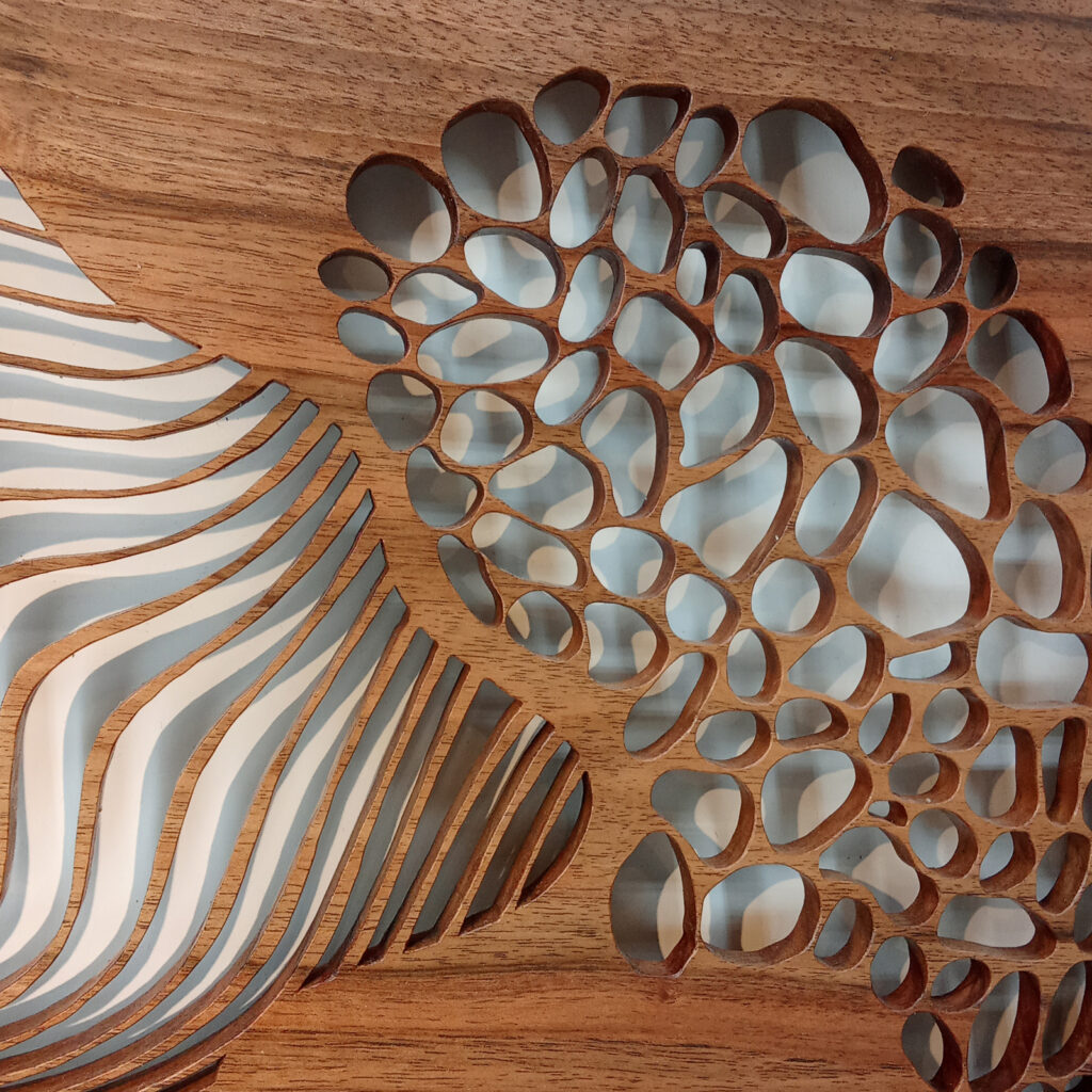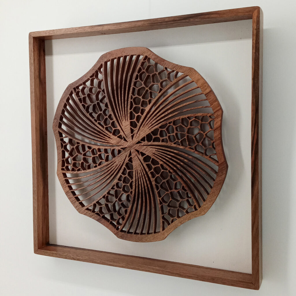 Les sculptures murales en bois présentées ici sont réalisées en dentelle de bois par Corinne Bouloc.