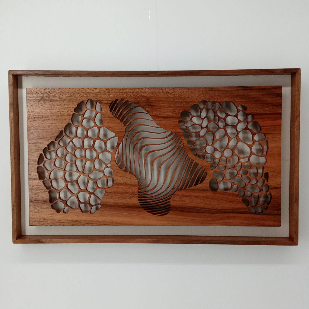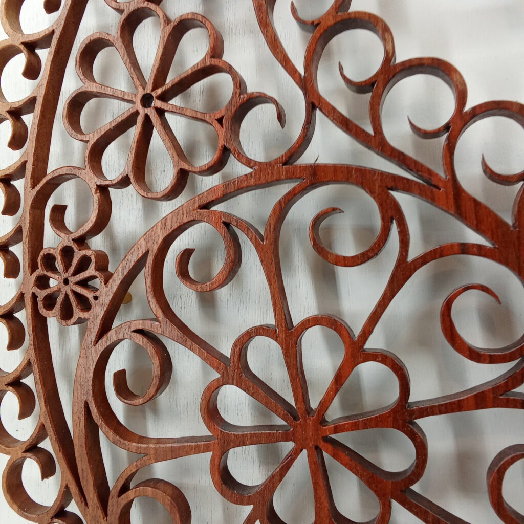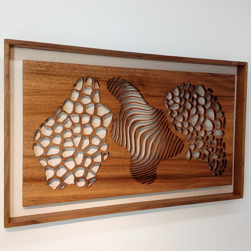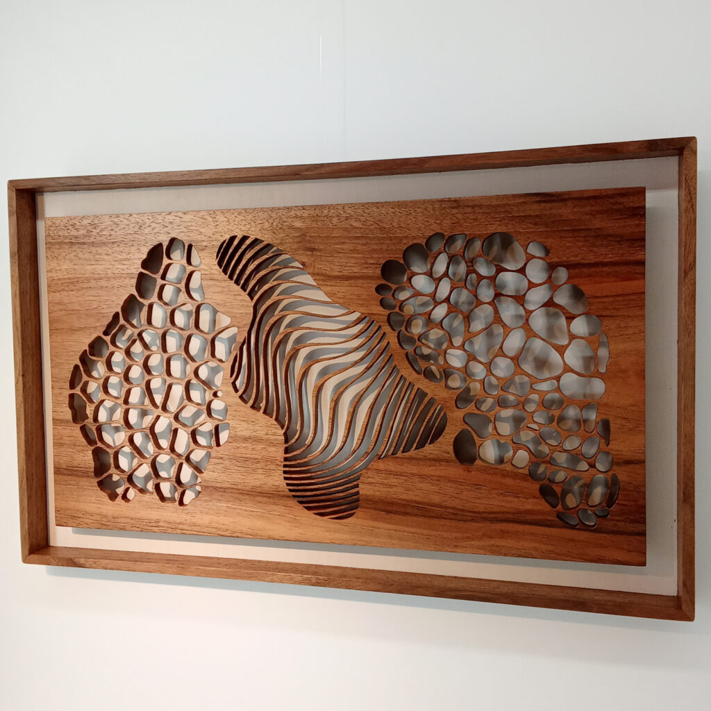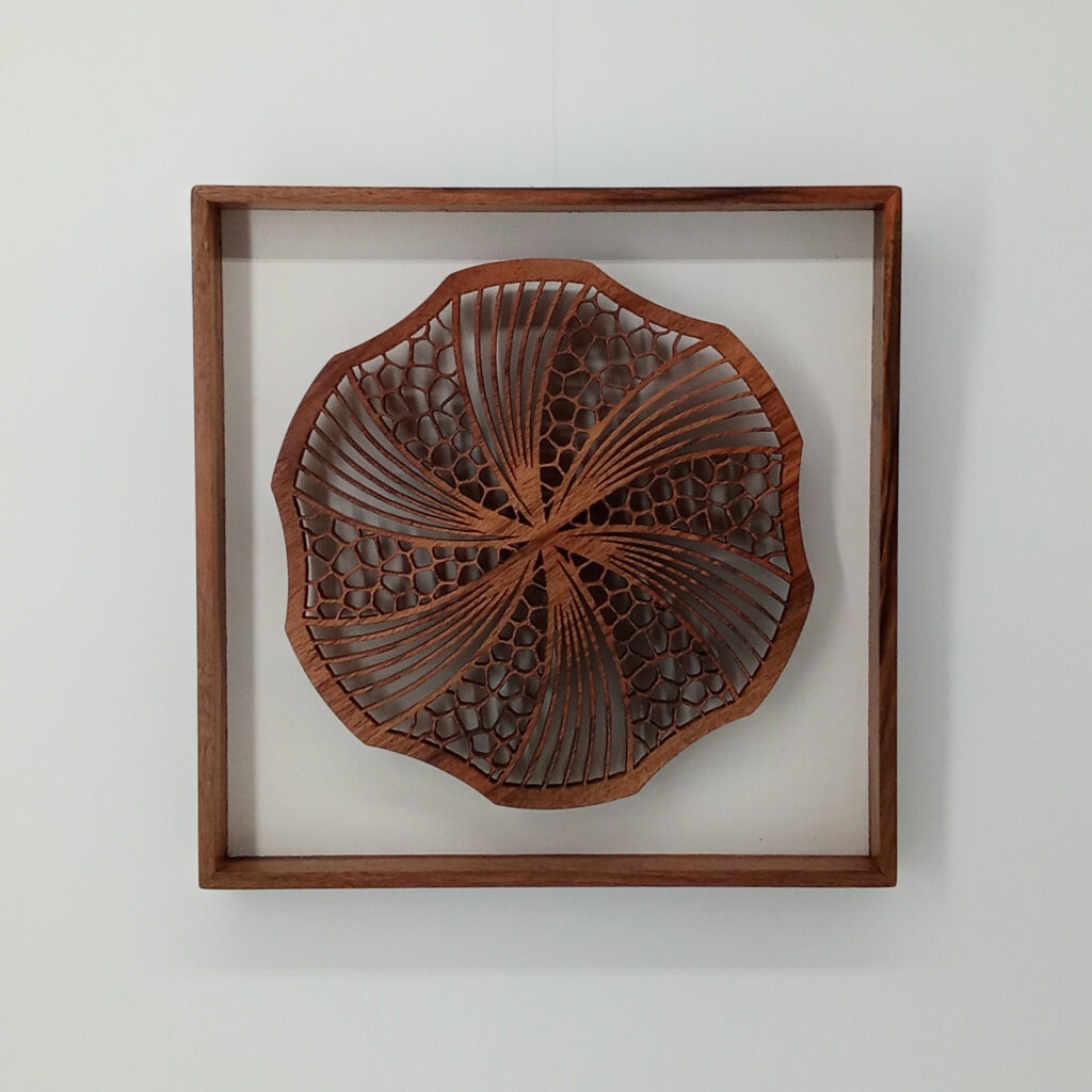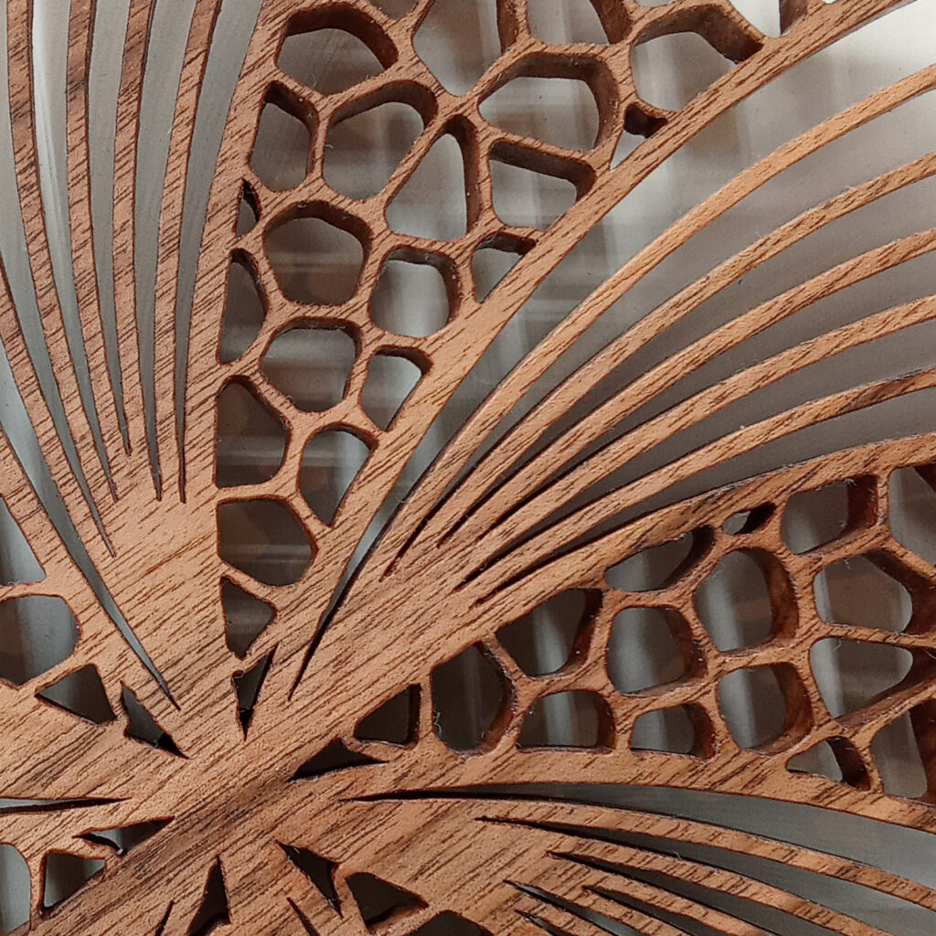 Les sculptures murales en bois présentées ici sont réalisées en dentelle de bois par Corinne Bouloc.