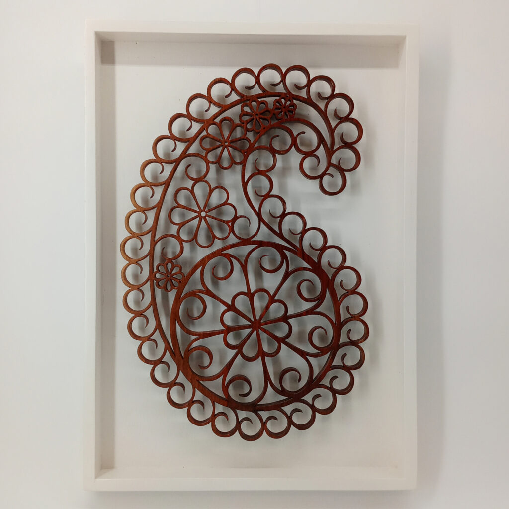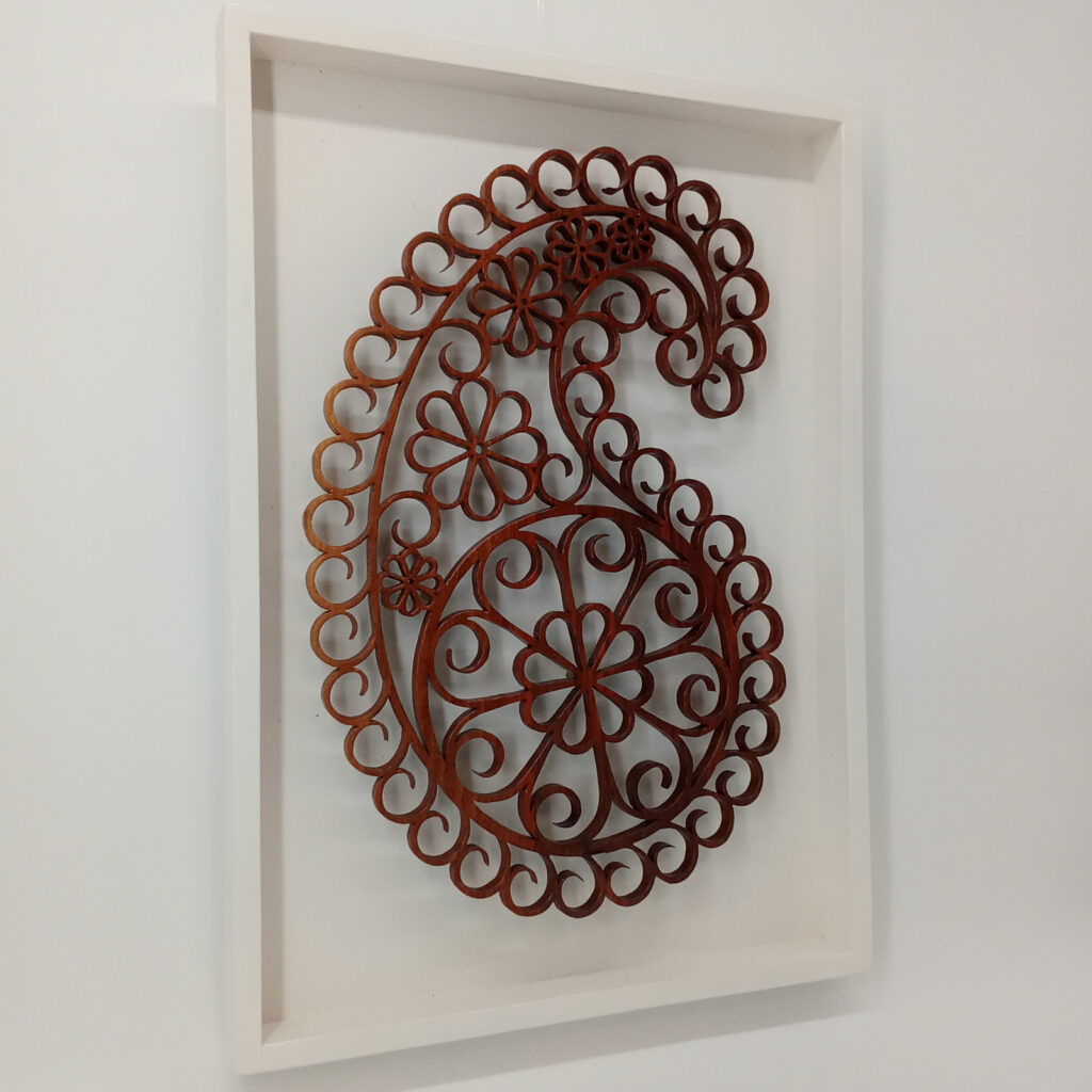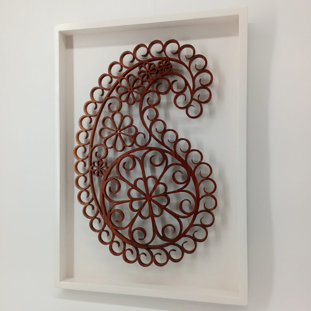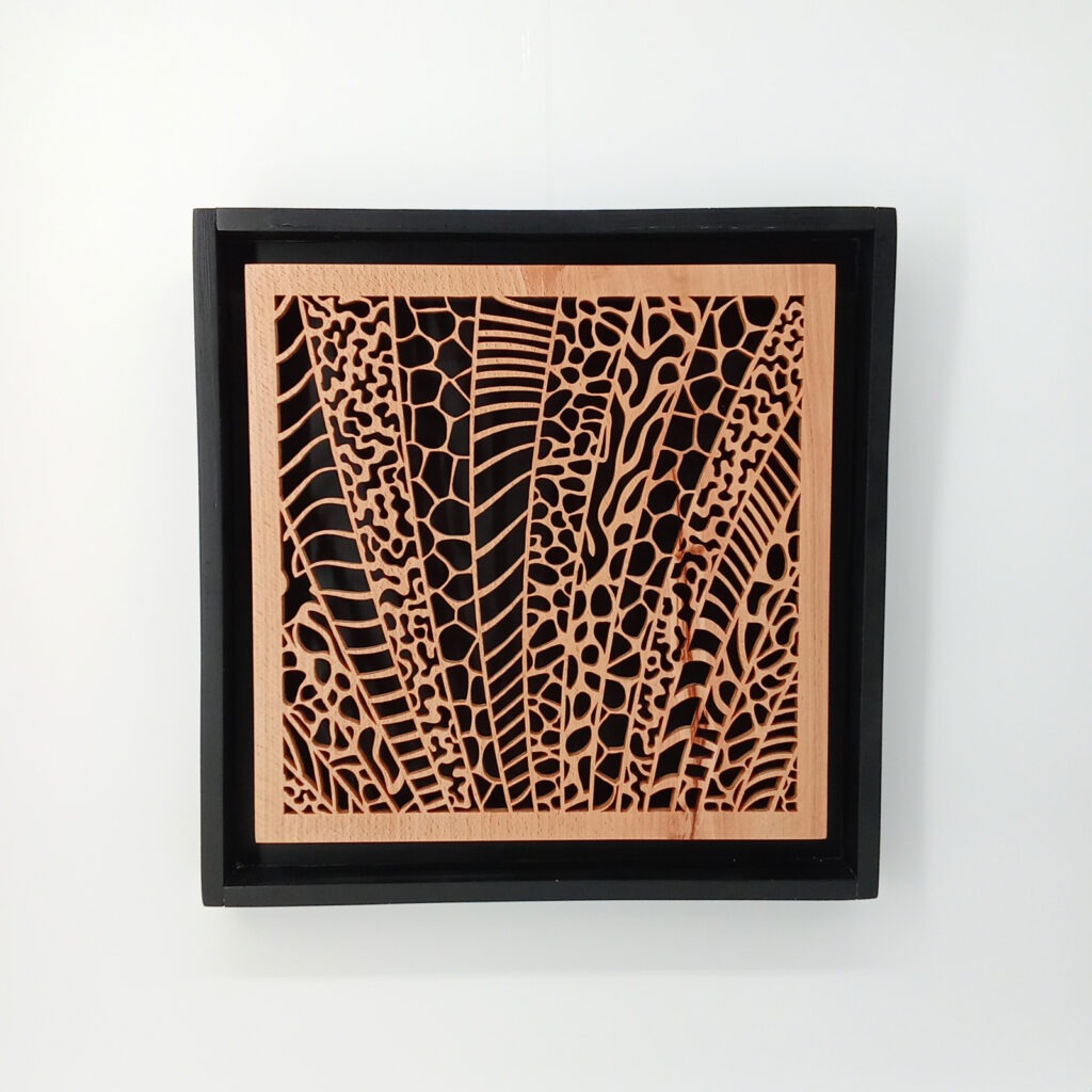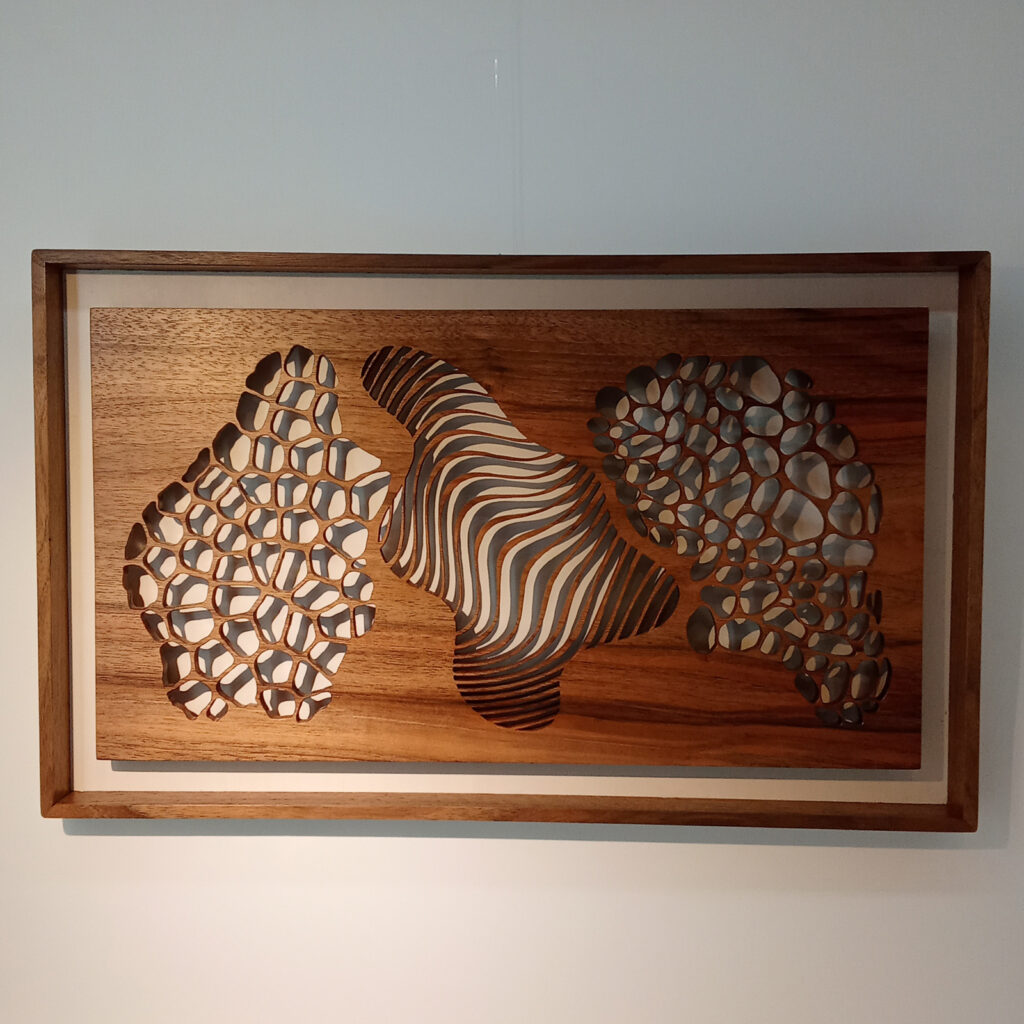 Les sculptures murales en bois présentées ici sont réalisées en dentelle de bois par Corinne Bouloc.