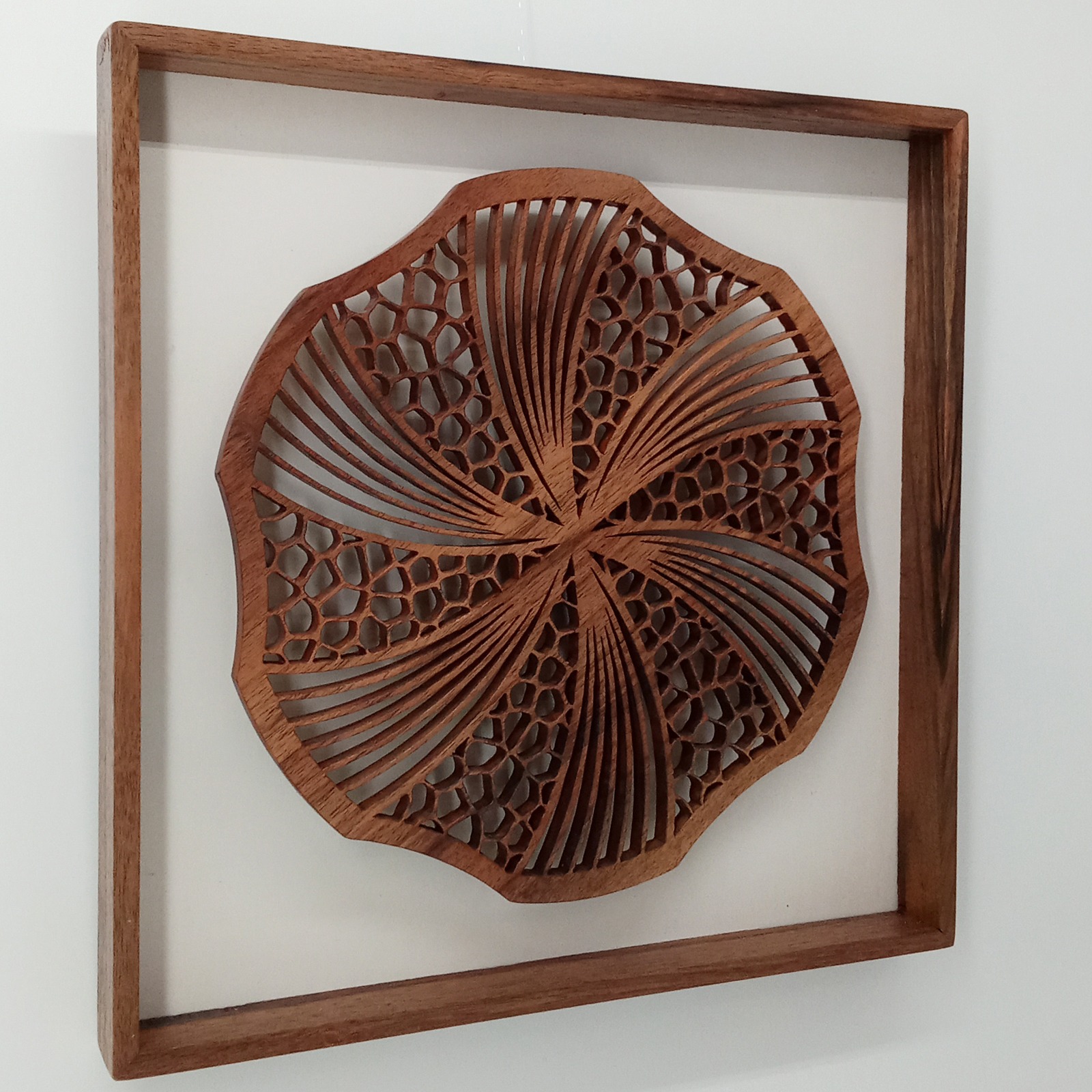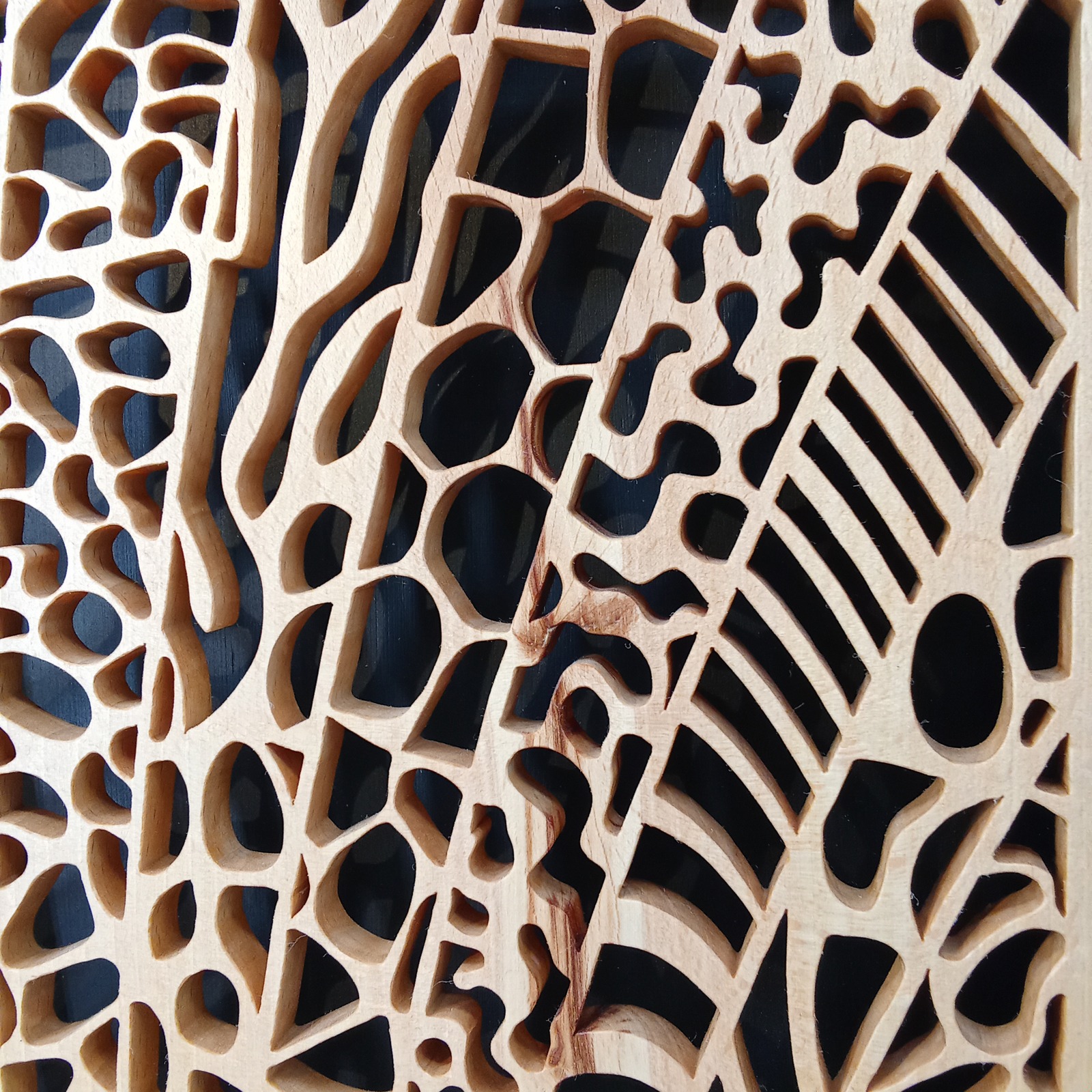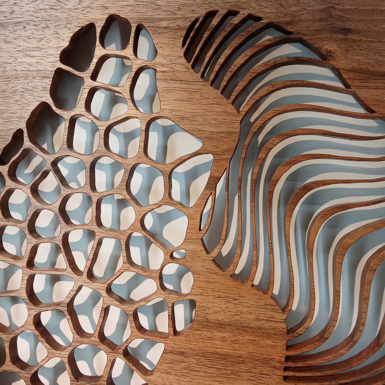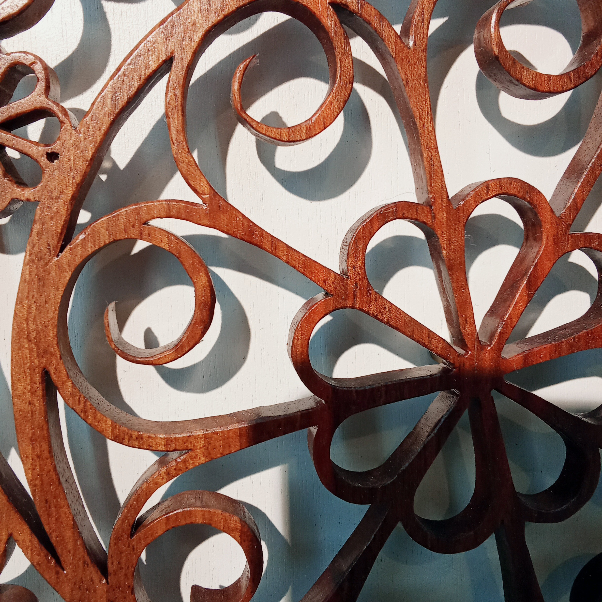 Les sculptures murales en bois présentées ici sont réalisées en dentelle de bois par Corinne Bouloc.