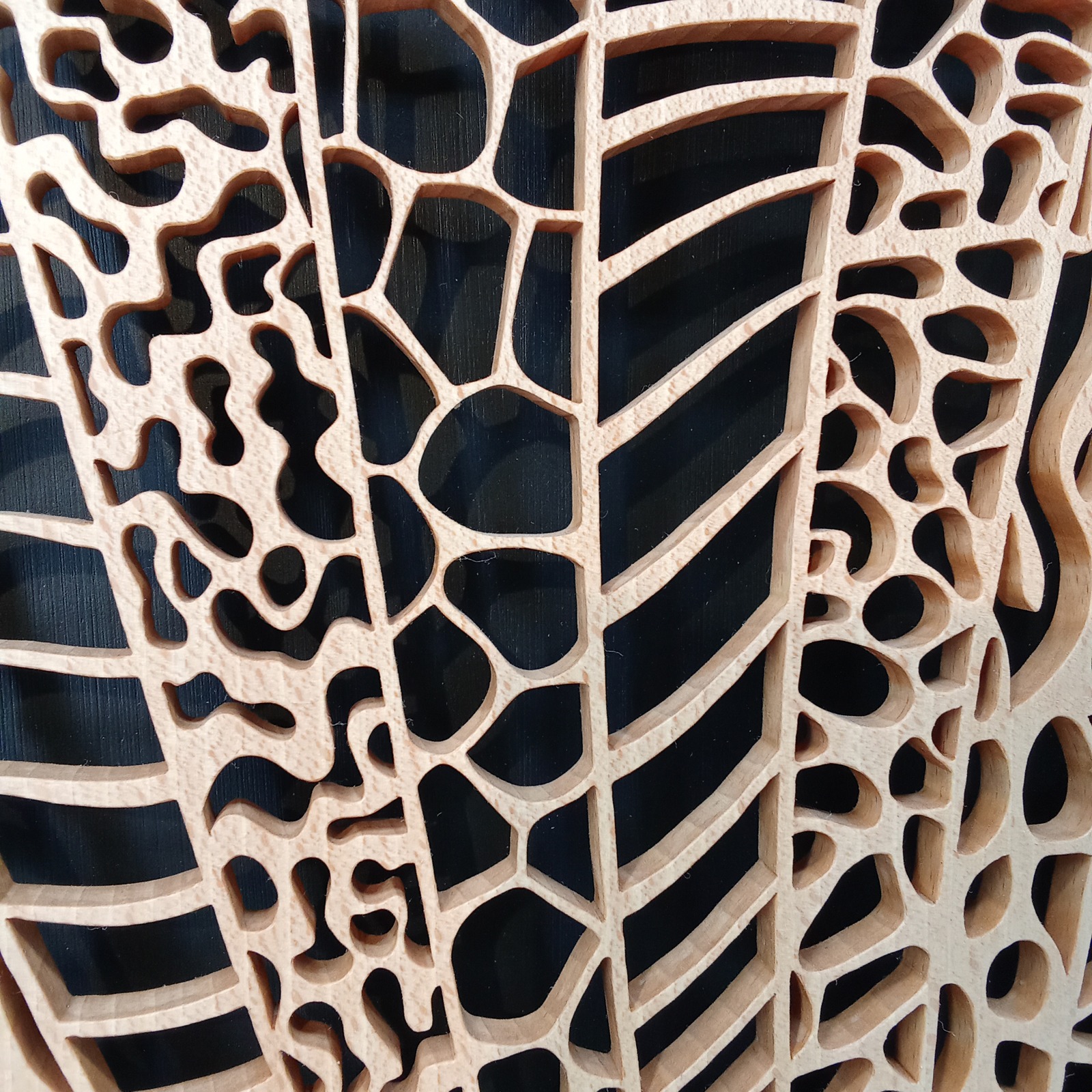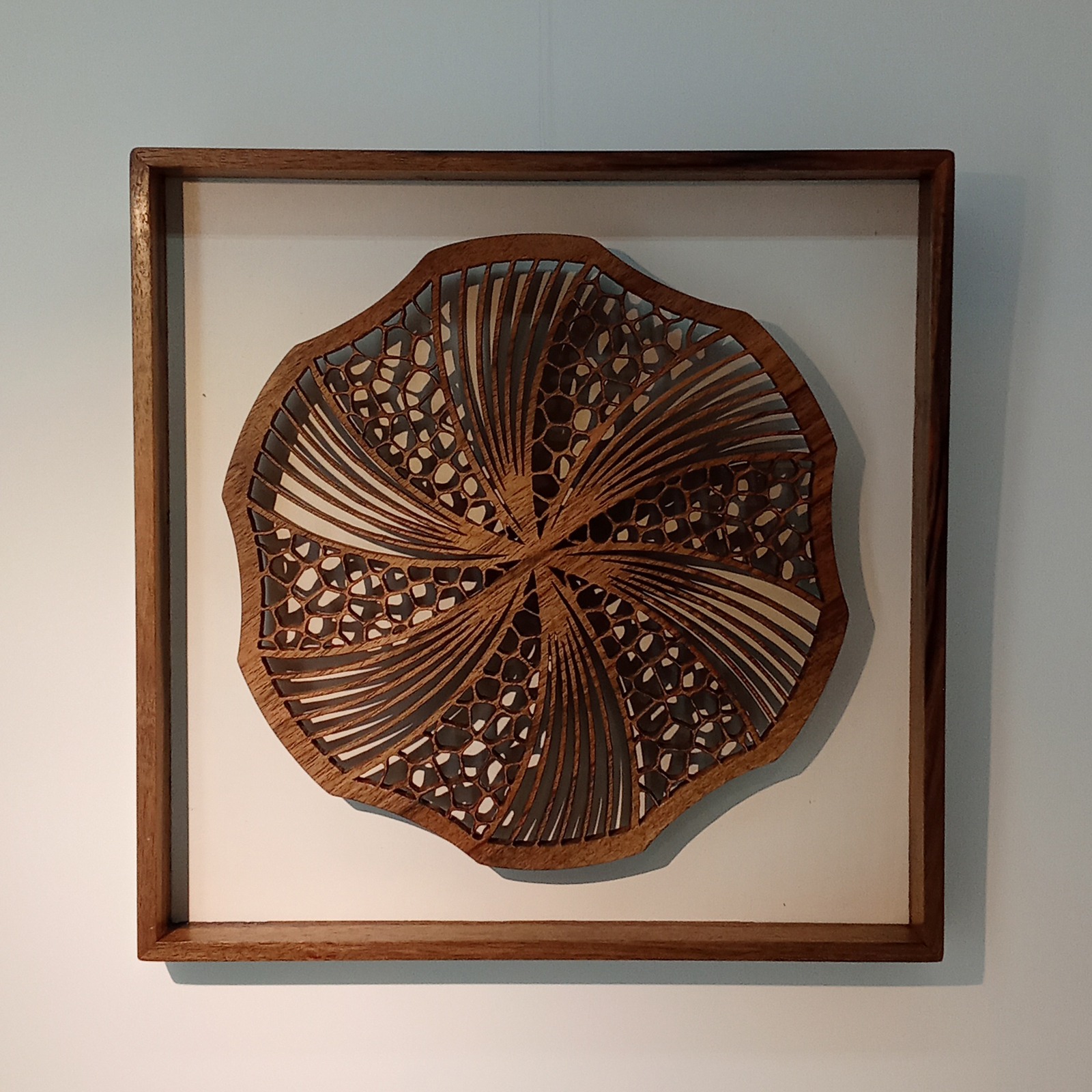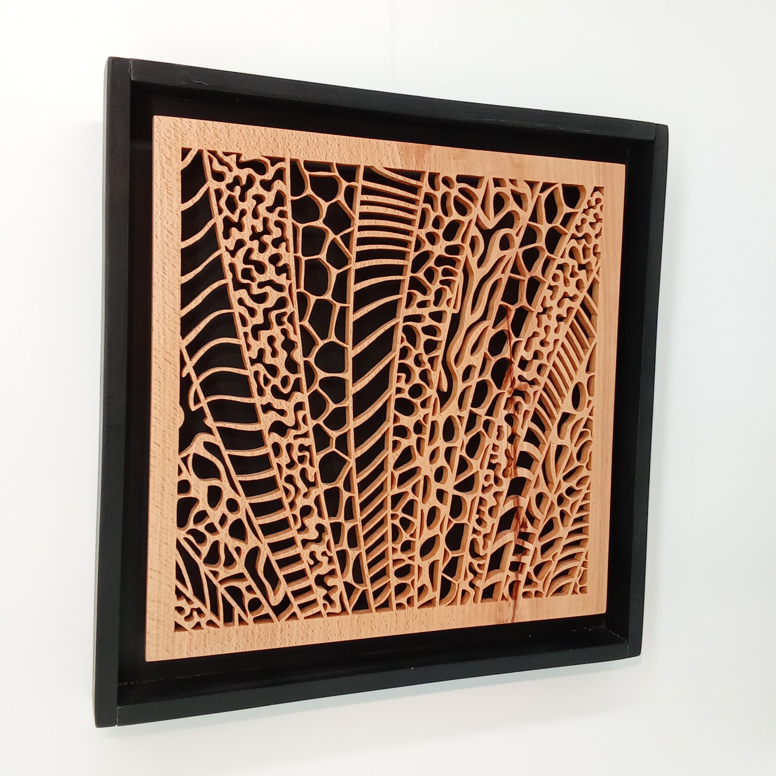 Les sculptures murales en bois présentées ici sont réalisées en dentelle de bois par Corinne Bouloc.