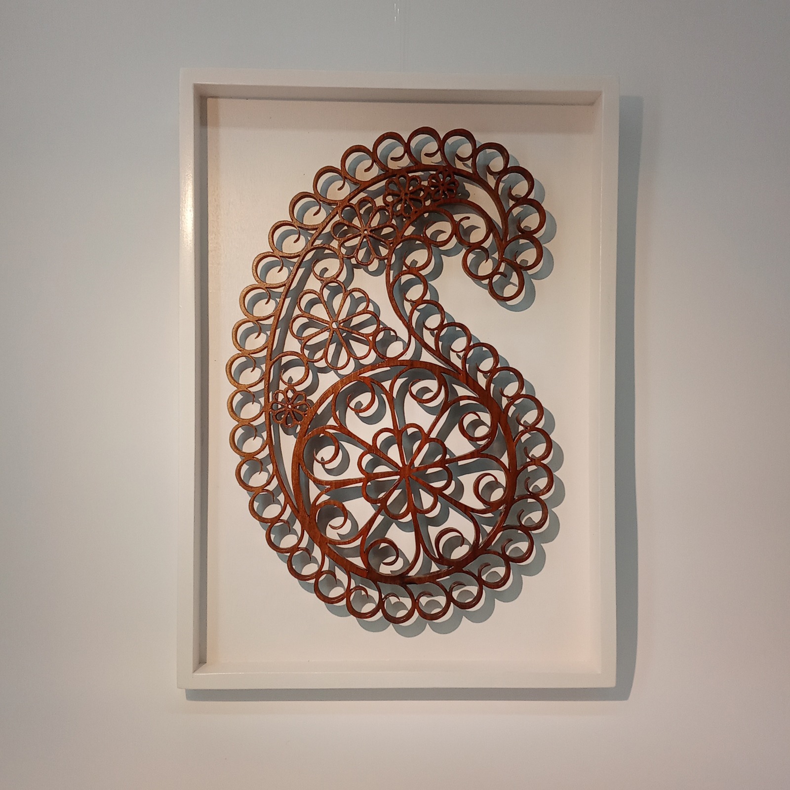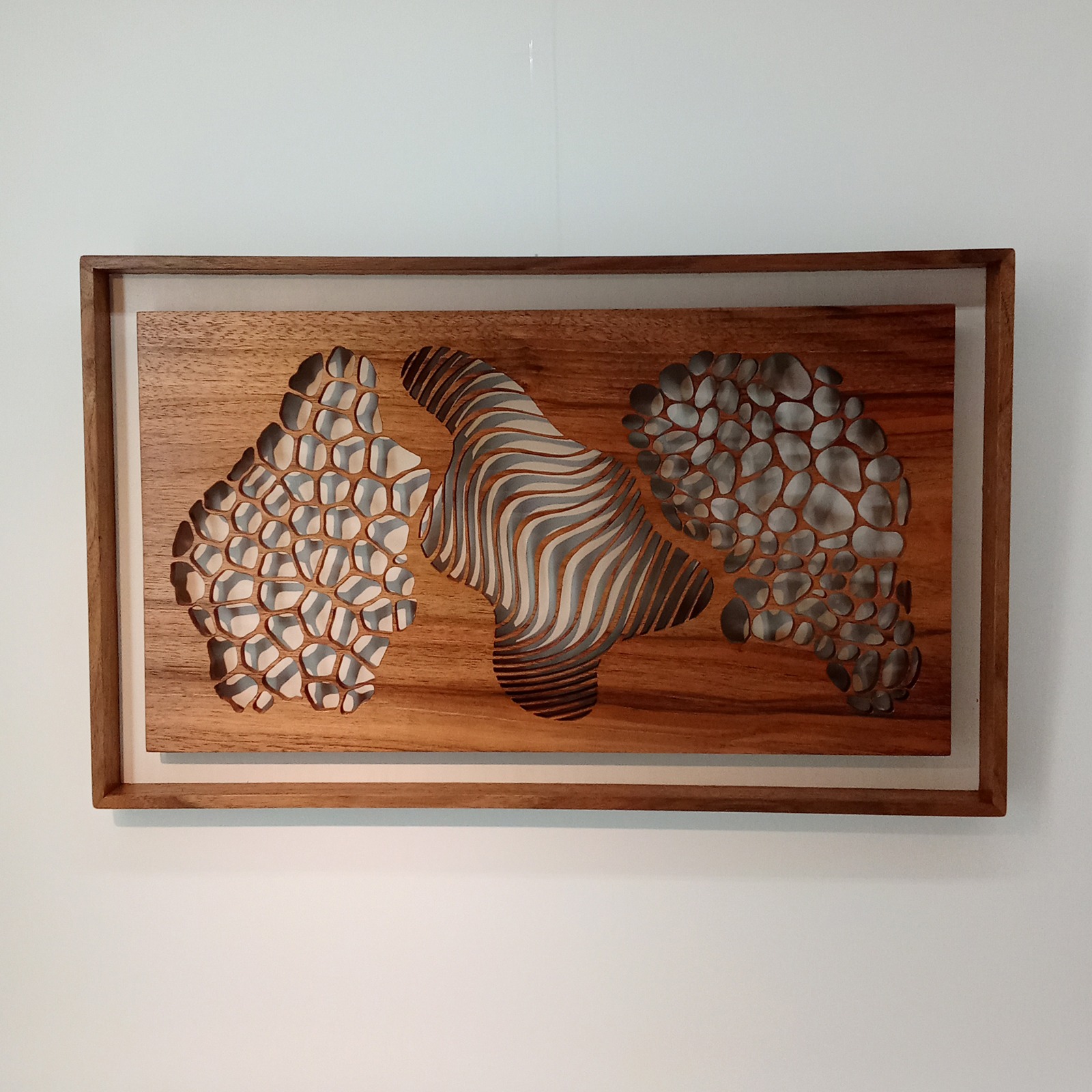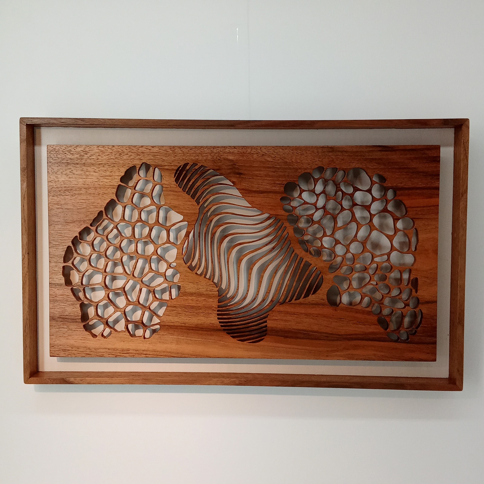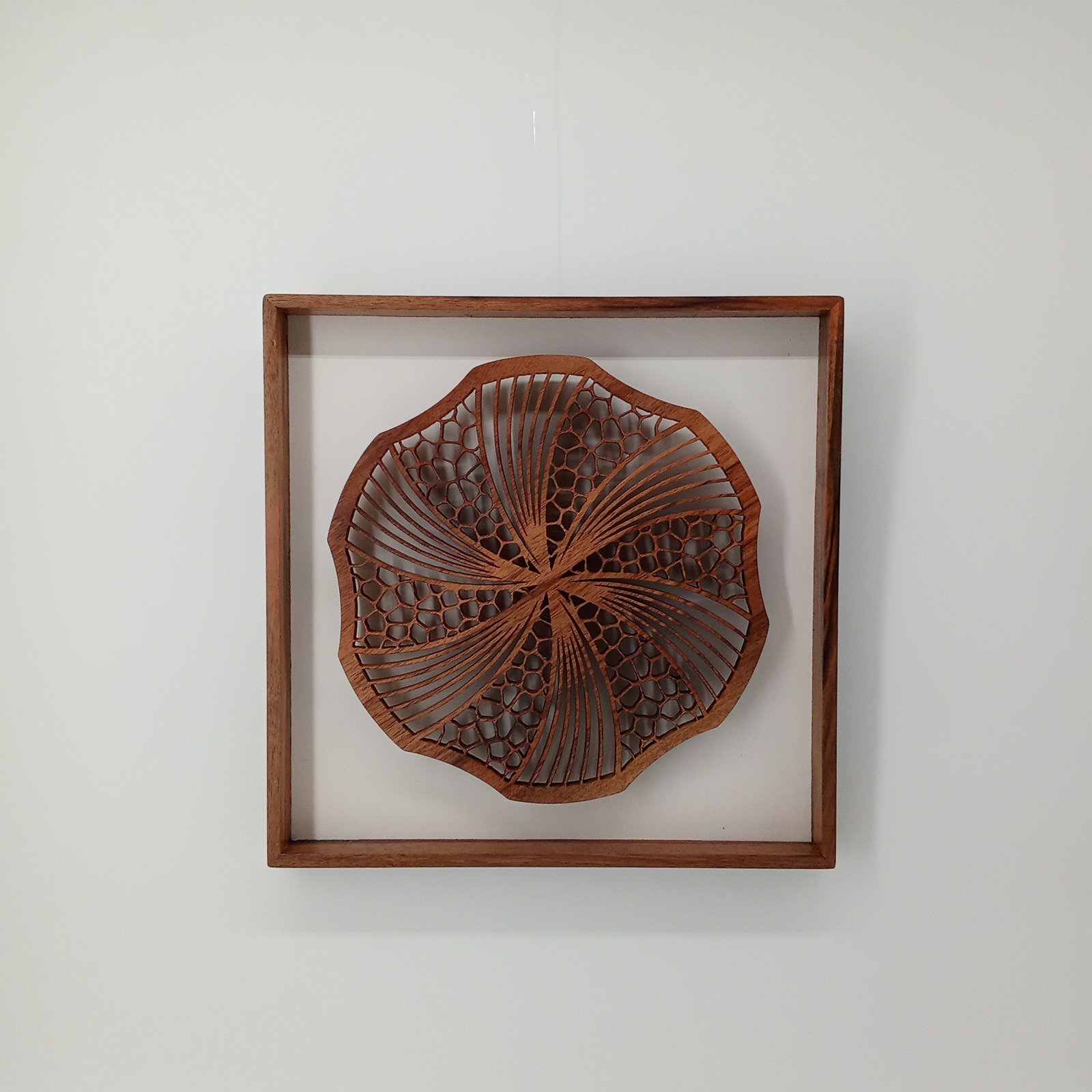 Les sculptures murales en bois présentées ici sont réalisées en dentelle de bois par Corinne Bouloc.